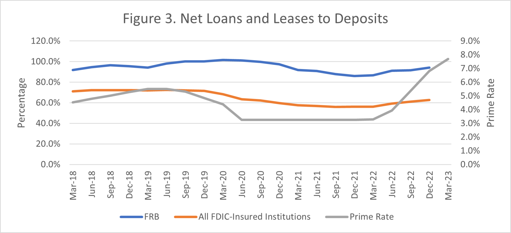 Figure 3 shows the net loans and leases to deposits for FRB and all FDIC insured institutions.