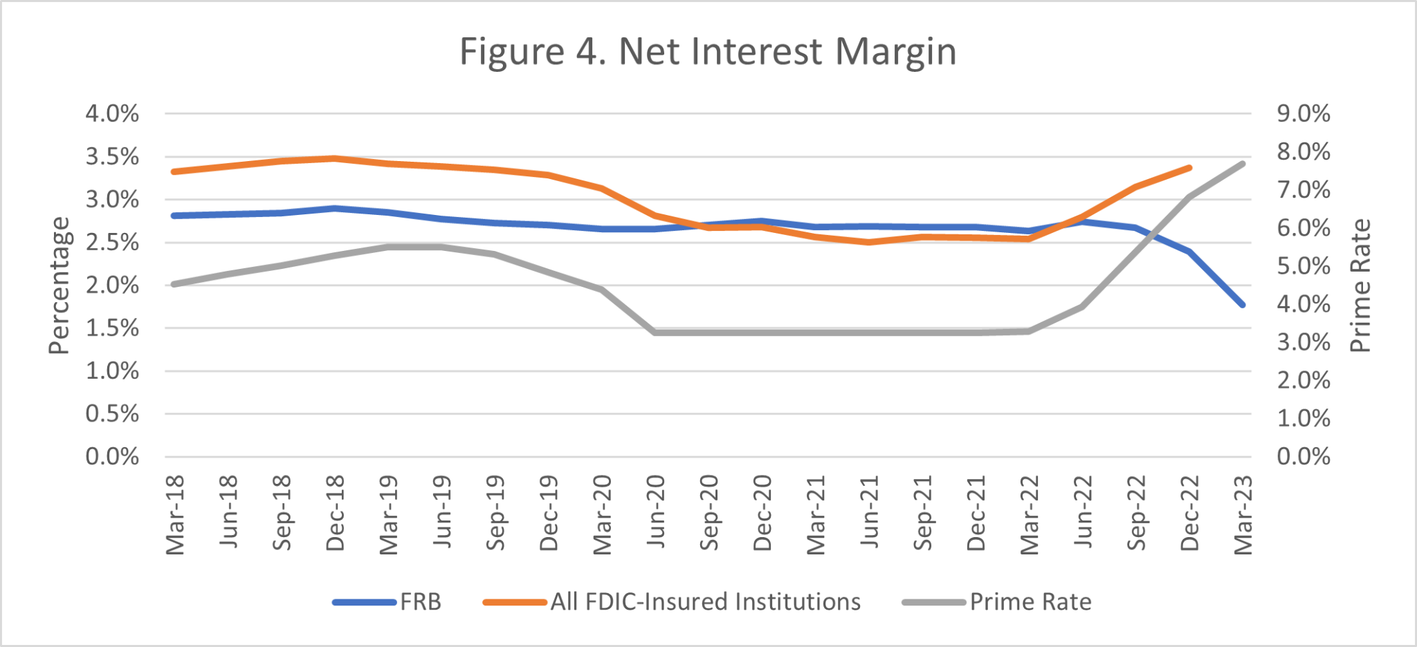 [1] Hayes, D. (2023, March 14). “SVB, Signature Racked up Some High Rates of Uninsured Deposits.” S&P Global Market Intelligence https://www.spglobal.com/marketintelligence/en/news-insights/latest-news-headlines/svb-signature-racked-up-some-high-rates-of-uninsured-deposits-74747639. [2] The bank level data examined are mostly from the FDIC but have been supplemented with the bank’s press release on April 24, 2023 which disclosed their financial results for the first quarter. The prime rate data are from the Fed. [3] Ensign, R. L., Brown, E., Andriotis A.M. and Heeb, G. (2023, May 1). Why First Republic Bank Collapsed. Wall Street Journal. https://www.wsj.com/articles/first-republic-bank-collapse-why-banking-crisis-61660d96 [4] First Republic Bank. (2023, April 24, 2023). First Republic Reports First Quarter 2023 Results [Press Release]. https://ir.firstrepublic.com/static-files/013f57fb-b980-4353-bbb3-0e7a3b27f20a