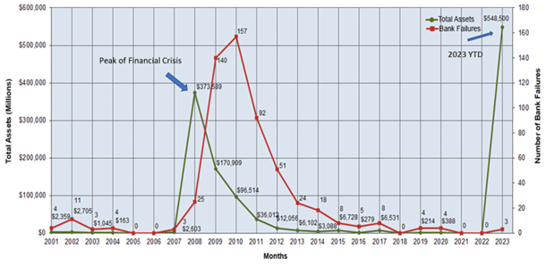 Although the number of bank failures this year is not particularly alarming, with $212 Billion in assets, the failure of FRB is the second largest in history, behind the 2008 failure of Washington Mutual Bank ($307 Billion in assets). The other failures this year were also large institutions, which again is significant. The graph below from the FDIC illustrates this. The green line shows total assets of failed institutions and the red line, the number of institutions. As shown, the total assets of failed institutions for the year are higher than at the peak of the financial crisis in 2008.