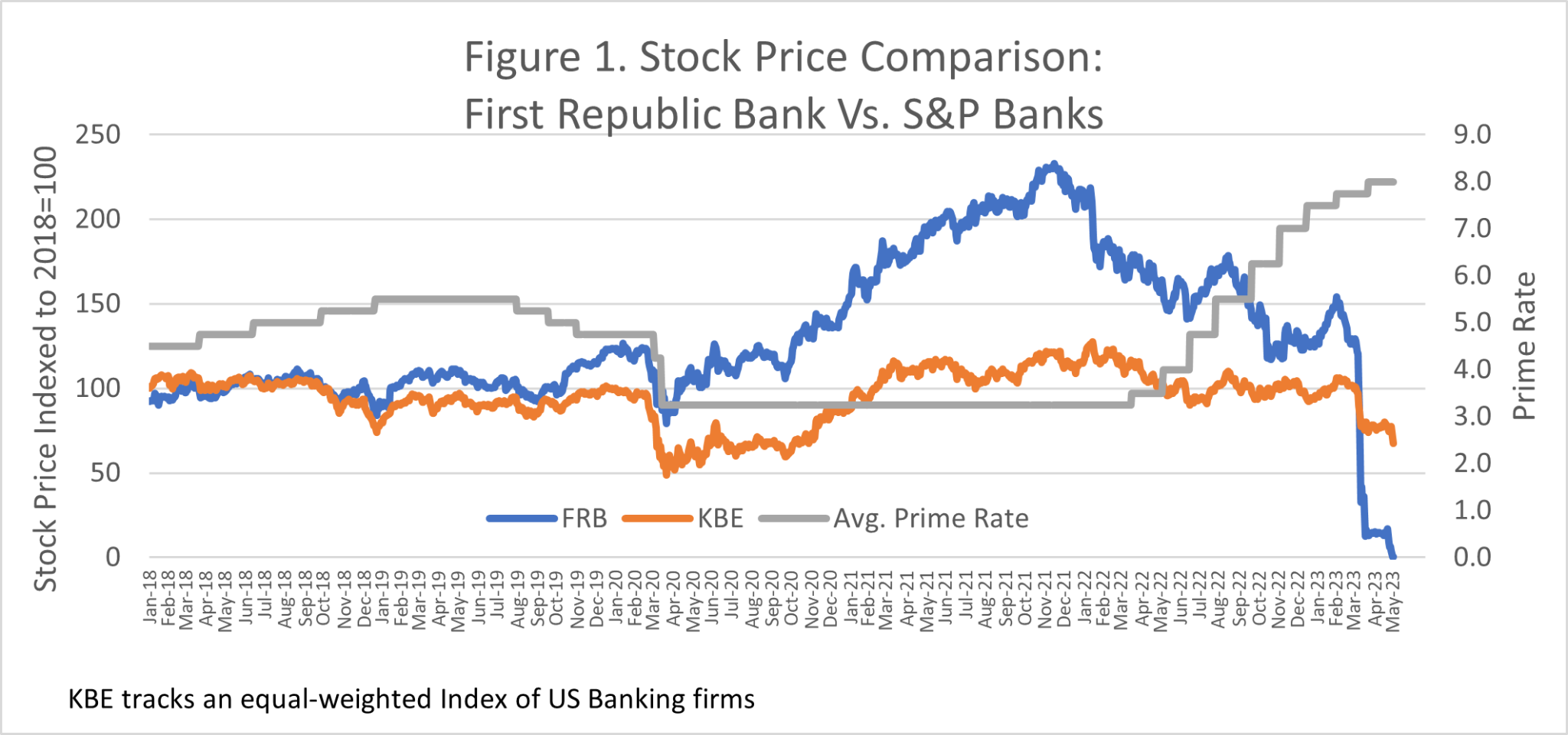Figure 1 shows stock prices for FRB and an index of S&P banks. Both series are indexed to 2018 prices so that a comparison of relative price performance can be displayed.