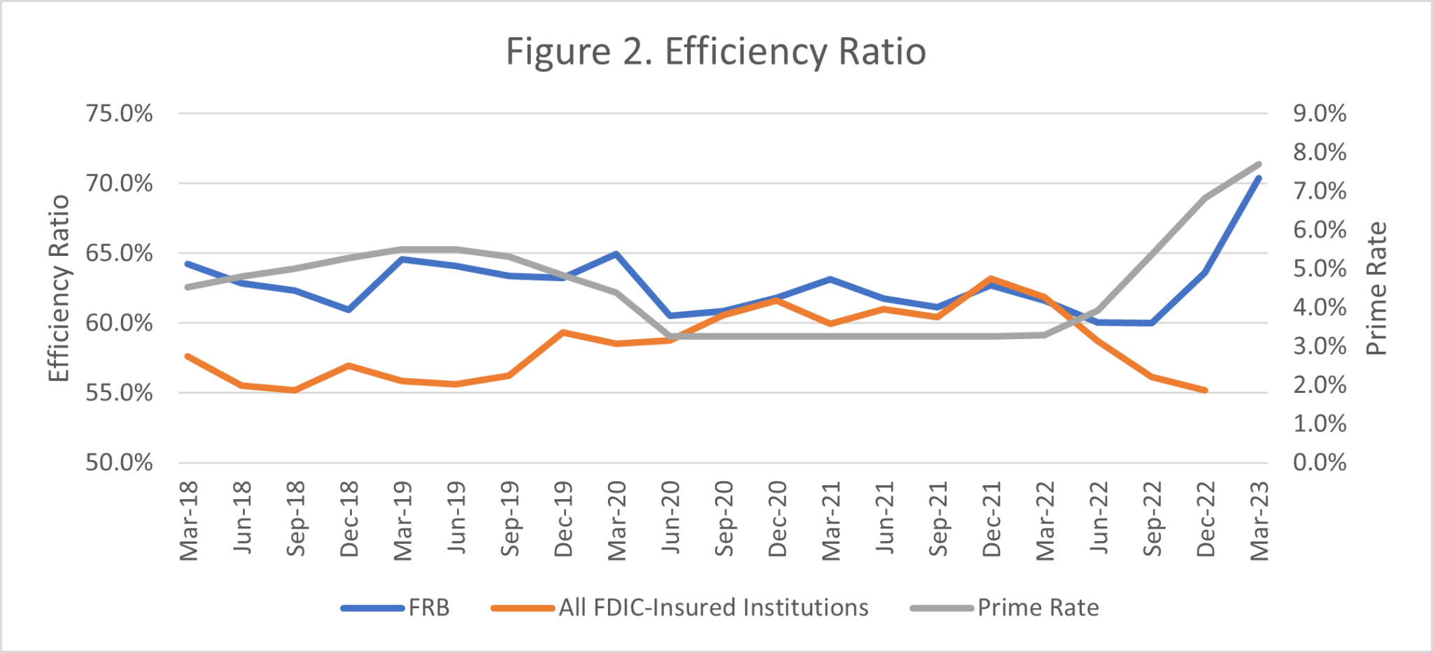 There were also warning signs in some of the commonly used financial measures.[2] Figure 2 compares the efficiency ratio of FRB to all FDIC insured Institutions.